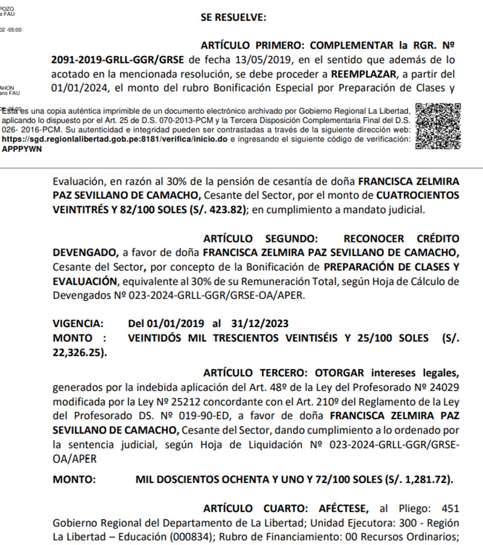 Un profesor cesante en Trujillo, Manuel Ruiz Briones, denunció penalmente y ante el Ministerio Educación estos pagos de hijo gerente a madre. Este miércoles el Gobierno Regional de La Libertad se ha visto obligado a anular todos los pagos ordenados por Martín Camacho Paz a su madre: 423.82 soles mensuales que cobró desde marzo del 2024, 22 mil 326.25 soles por supuestas bonificaciones impagas de cinco años y mil 281.71 soles por intereses legales.