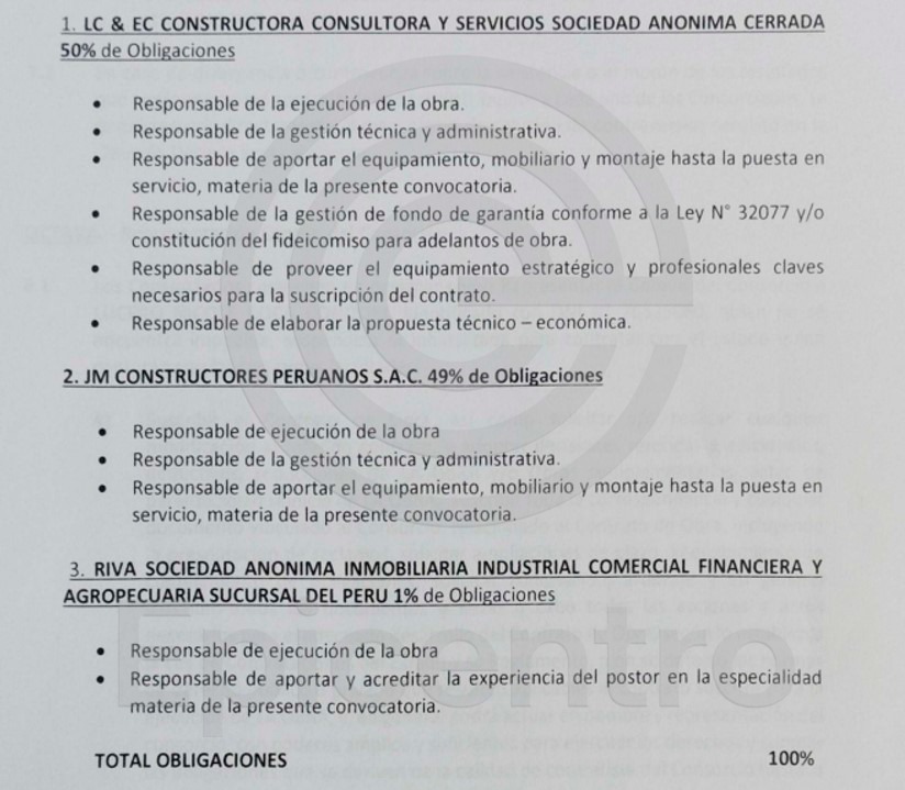 Así lo consigna el Acta de Buena Pro, del 24 de abril de este año, que revisó Epicentro Tv, en exclusiva. Lucero llegó a Junín con la misma empresa argentina, Riva S.A. El contrato del consorcio y de la propia obra aún no son públicos en el OECE, pero el Gobierno Regional precisó que las obligaciones fueron parecidas. La empresa de Lucero tiene una participación del 97 % y Riva, del 3 %. Claramente, el aporte de Riva es la certificación de la experiencia.