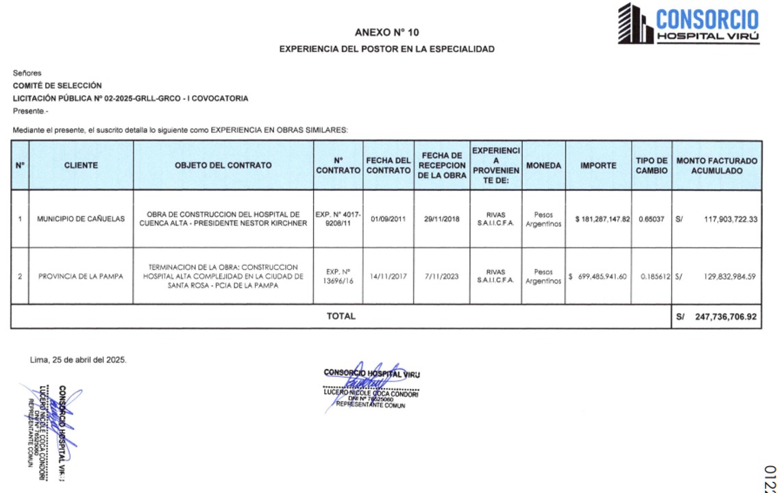 Riva S.A. presentó el contrato de la obra del Hospital de Cuenca Alta "Presidente Néstor Kirchner" que hizo para el municipio de Cañuelas, Argentina, en el 2011. Dicha obra se valorizó en más de S/117 millones y permitió acreditar la "experiencia" de todo el consorcio.