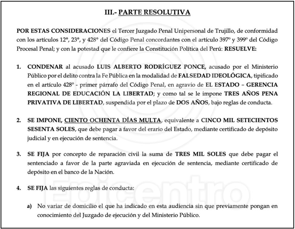 La sentencia del Tercer Juzgado Penal Unipersonal de Trujillo señala que Rodríguez obtuvo el título de Docente de Educación Primaria sin haber cursado ni un solo día de estudios en el Instituto Pedagógico Virgen de La Puerta, de Trujillo.