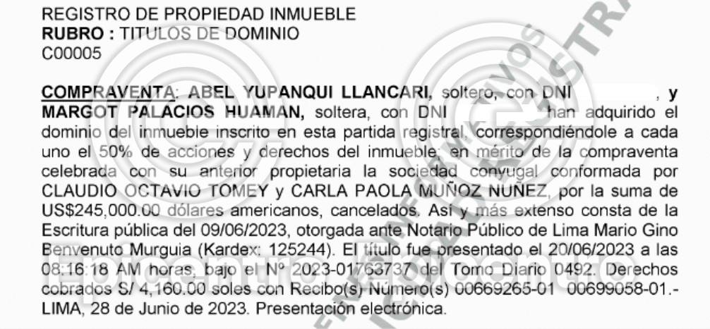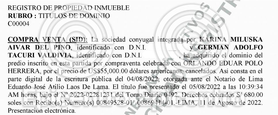 Los Registros Públicos ofrecen una pista sobre este aumento: en 2022, Tacuri adquirió un departamento en Lima por US$ 55,000 (aproximadamente S/214,500 al cambio de la fecha), pagado íntegramente al contado.