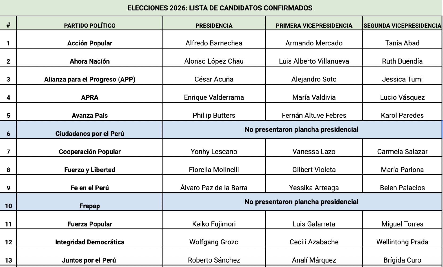 Según el calendario de la Oficina Nacional de Procesos Electorales (ONPE) los partidos ya eligieron a sus candidatos en las elecciones internas que se llevaron a cabo en las últimas semanas. Sin embargo, no será hasta el 23 de diciembre que oficialmente se conozca las fórmulas y listas definitivas para las elecciones 2026.