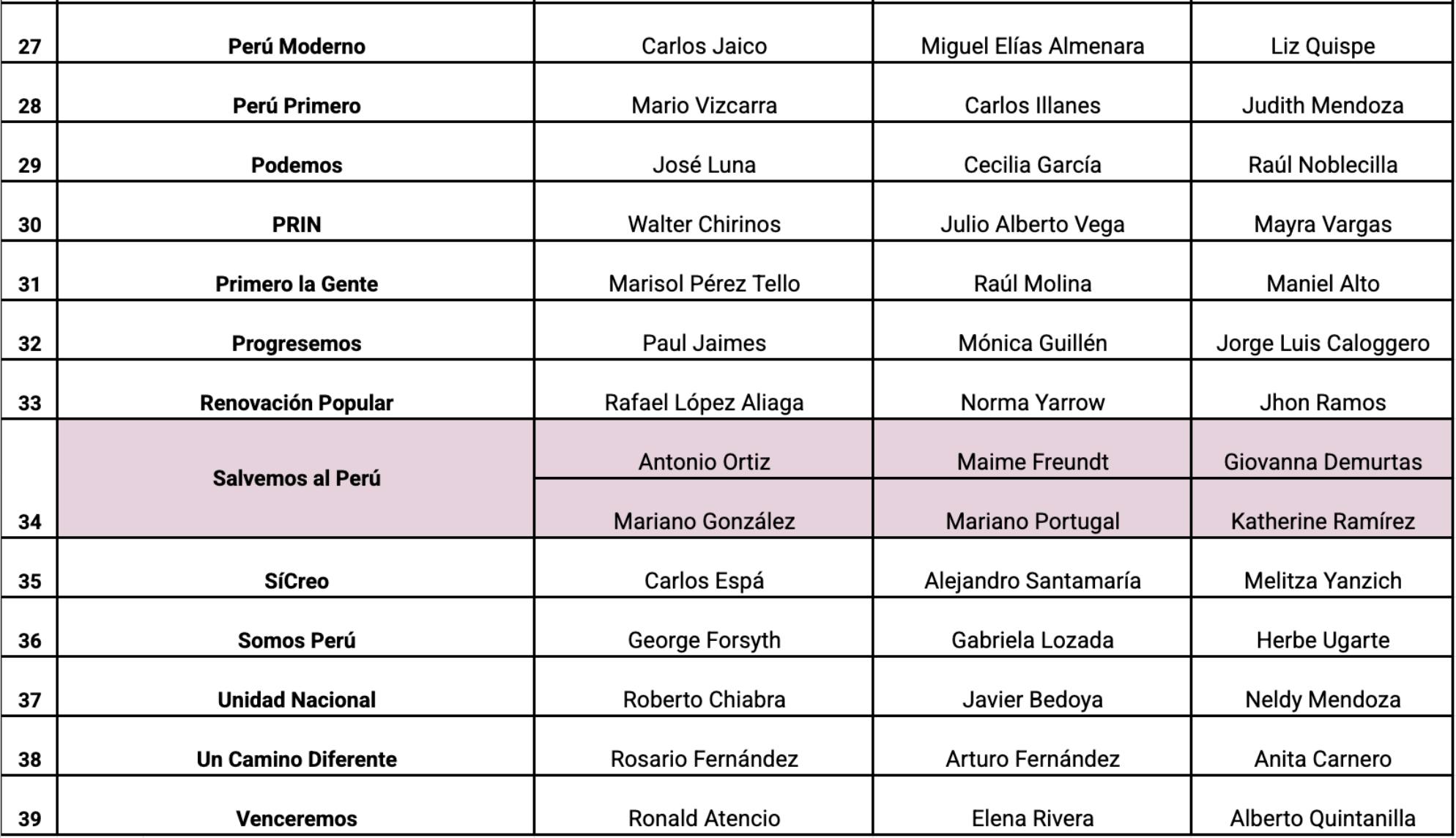Cabe destacar que tras las elecciones primarias del 7 de diciembre, el partido Salvemos al Perú (subrayado de rojo) es el único que actualmente cuenta con dos listas, pues ambas obtuvieron el mismo porcentaje de votos; es decir, hubo un empate. De acuerdo con la ONPE,  ante un caso así, el ganador debe definirse mediante un sorteo público, un mecanismo excepcional, pero previsto en ley.