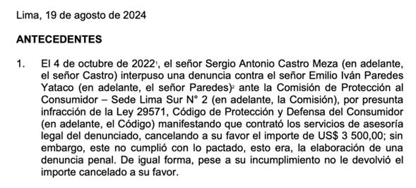 Este proceso se inició en octubre de 2022 con la denuncia de Castro. En octubre de 2023, una comisión de Indecopi ya había ordenado la devolución del dinero y aplicó una sanción preliminar. Paredes apeló, manteniendo su defensa. Sin embargo, la Sala Especializada confirmó la resolución el 19 de agosto de 2024, ratificando tanto la multa como la obligación de reembolso.