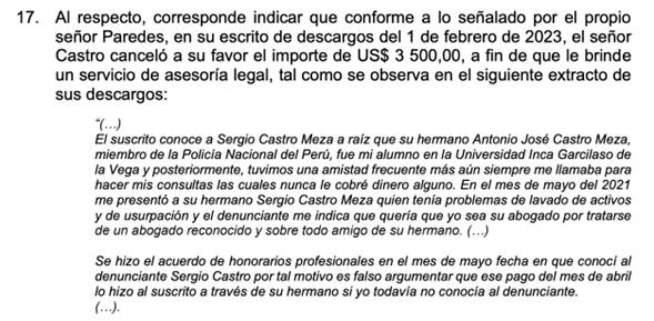 Según el descargo que realizó el ahora presidente del INPE, se llevaron a cabo tratativas para defender a Castro Meza en un caso de lavado de activos.