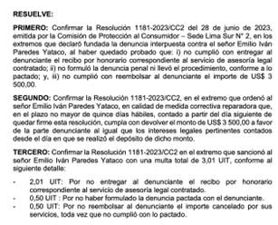 La sanción mencionada se encuentra en la Resolución N.º 2304-2024/SPC-INDECOPI, emitida el 19 de agosto de 2024, que concluyó que Paredes incumplió un contrato de asesoría legal acordado en mayo de 2021 con Sergio Antonio Castro Meza. Castro había pagado 3,500 dólares para que Paredes lo representara en un caso de lavado de activos y elaborara y presentara la denuncia penal. Sin embargo, no se emitió recibo por honorarios, no se presentó la denuncia acordada y el dinero no fue devuelto.