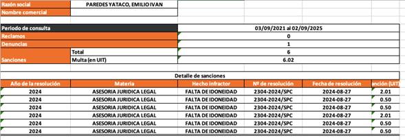 Asimismo, Indecopi dispuso la inscripción del señor Paredes en el Registro de Infracciones y Sanciones del Indecopi (RIS); tras la obtención de la información, se confirmó que el funcionario registra por este caso un total de 6 sanciones y 6.02 Unidades Impositivas Tributarias, tal como se puede visibilizar en la imagen.