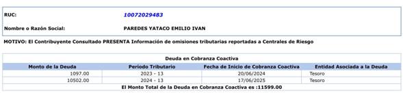 A ello se suma una deuda coactiva registrada en la Central de Riesgos de la SUNAT por 11 mil 599 soles, correspondiente a obligaciones tributarias no canceladas que ya pasaron a la vía de cobro administrativo coercitivo. Este registro no solo afecta su solvencia crediticia, sino que refleja un incumplimiento formal con el Estado, lo que resulta especialmente grave en un funcionario nombrado al frente de una institución pública.
