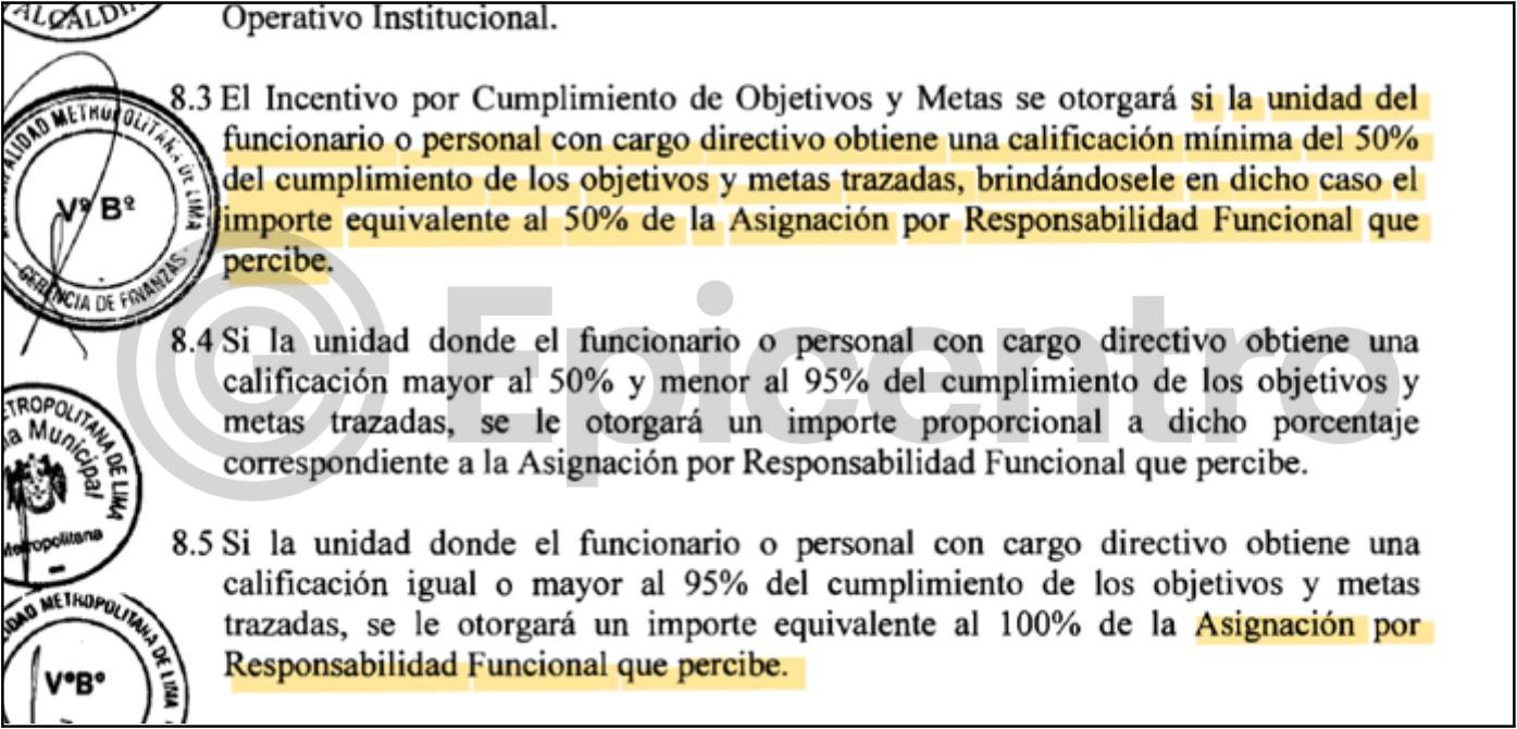 Epicentro Tv afirmó el martes que bastaba con que la unidad o el área obtenga una calificación mínima de 50% para que sus funcionarios comiencen a percibir dicho incentivo, según una directiva de Susana Villarán.