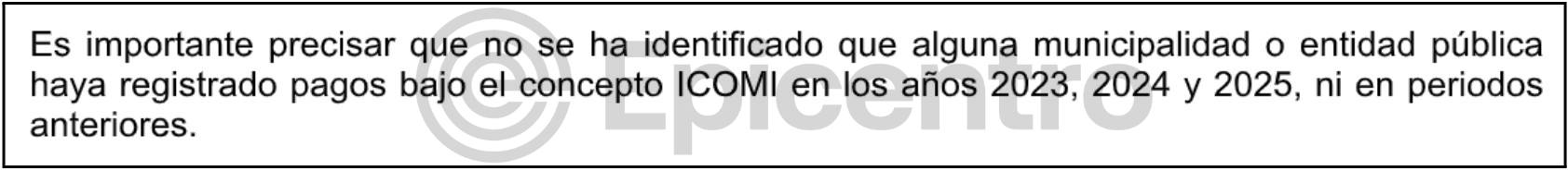 "Es importante precisar que no se ha identificado que alguna municipalidad o entidad pública haya registrado pagos bajo el concepto ICOMI en los años 2023, 2024 y 2025, ni en periodos anteriores".