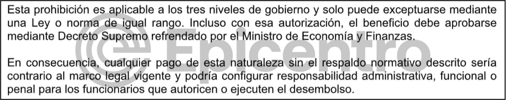 "En consecuencia, cualquier pago de esta naturaleza sin el respaldo normativo descrito sería contrario al marco legal vigente y podría configurar responsabilidad administrativa, funcional o penal para los funcionarios que autoricen o ejecuten el desembolso".