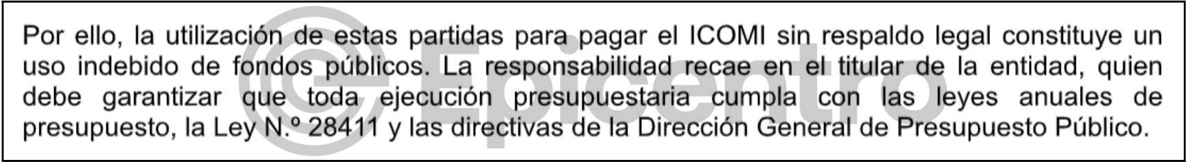 "La utilización de estas partidas para pagar el ICOMI sin respaldo legal constituye un uso indebido de fondos públicos. La responsabilidad recae en el titular de la entidad, quien debe garantizar que toda ejecución presupuestaria cumpla con las leyes anuales de presupuesto, la Ley N.º 28411 y las directivas de la Dirección General de Presupuesto Público".