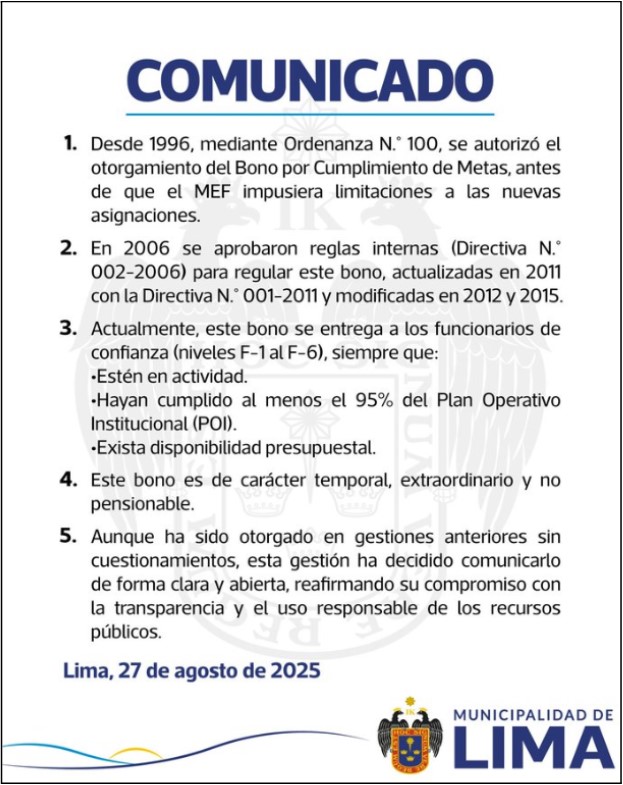 ¿La gestión de Rafael López Aliaga contó con una ley o un decreto supremo que autorizara los seis desembolsos por 4 millones de soles? El comunicado de la Municipalidad de Lima no dice nada de eso.