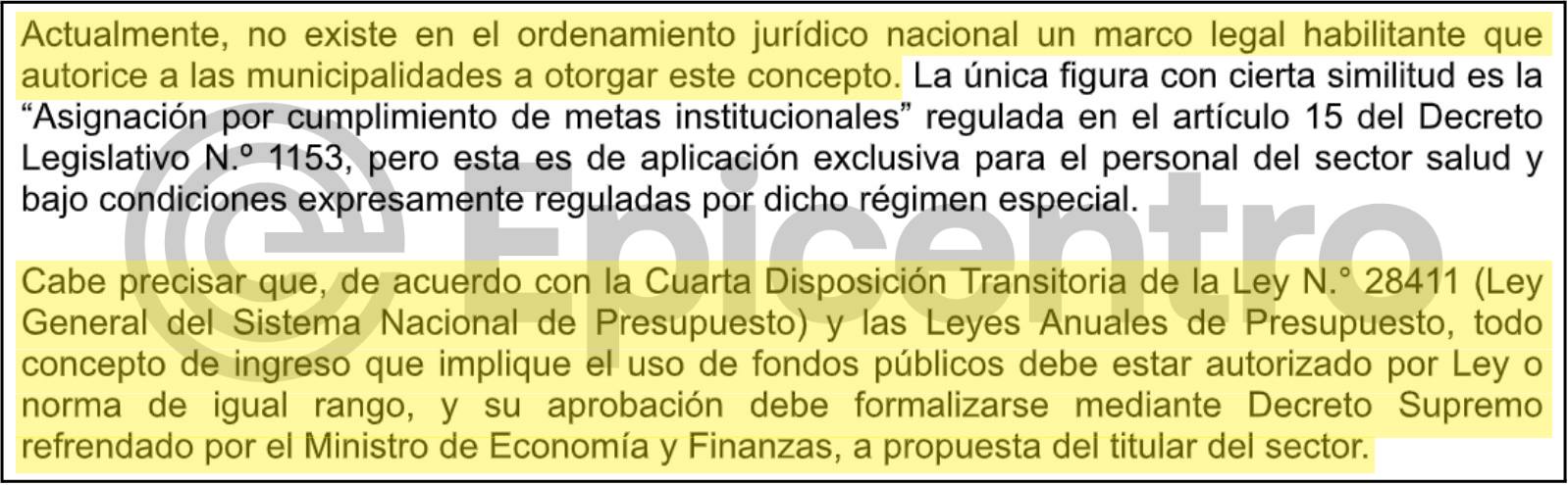"No existe en el ordenamiento jurídico nacional un marco legal habilitante que autorice a las municipalidades a otorgar este concepto (...) de acuerdo con la Cuarta Disposición Transitoria de la Ley N.° 28411 (Ley General del Sistema Nacional de Presupuesto) y las Leyes Anuales de Presupuesto, todo concepto de ingreso que implique el uso de fondos públicos debe estar autorizado por Ley o norma de igual rango, y su aprobación debe formalizarse mediante Decreto Supremo refrendado por el Ministro de Economía y Finanzas, a propuesta del titular del sector".