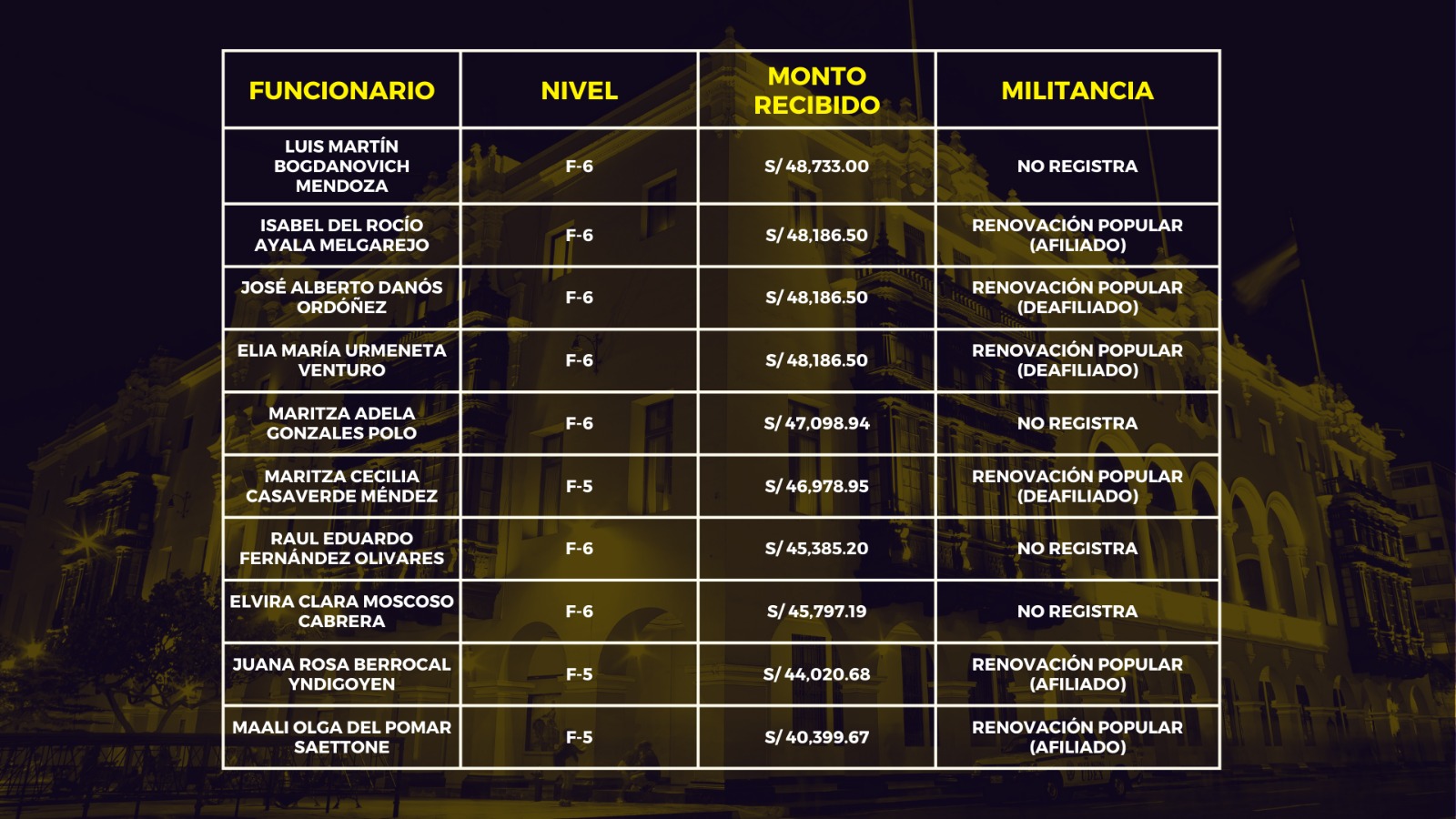 Recibieron S/ 9,886.93 José Danós Ordóñez, secretario general del Consejo -esposo de la congresista fujimorista Patricia Juárez-; María del Pilar Urmeneta Venturo, gerente de Desarrollo Económico; Isabel Ayala Melgarejo, gerente de Desarrollo Humano; y Hugo Fernando Valderrama Chávez, gerente de Fiscalización y Control.