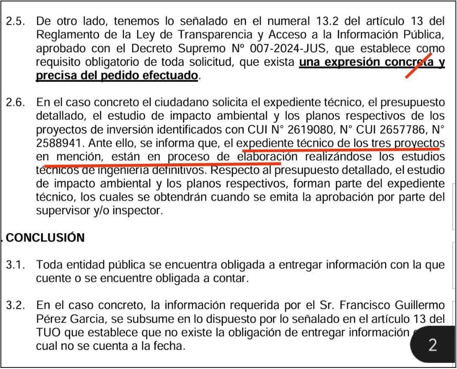 Por otro lado, el expediente técnico no es un mero papel formal, sino que implica el análisis costo/beneficio que nos permite saber cómo se ha llegado a la conclusión que el diseño que se ha escogido es el más razonable dentro de otras opciones posibles. Sin expediente técnico se está violando el principio de transparencia pues es necesario conocer los planos y geometría que se va a utilizar, no quedarse con los modelados en 3D. Pero la MML no solo viola el principio de transparencia sino también la Ley de Acceso a la Información Pública. El Tribunal de Transparencia del Ministerio de Justicia (MINJUS) falló a favor del periodista Francisco Pérez del medio Spacio Libre (6), quien junto a la Asociación Nacional de Periodistas, logró que la MML confirmara lo que era verificable mediante el portal invierte.pe: que no existe expediente técnico, ni estudio de impacto ambiental alguno, sino que ambos están en proceso.