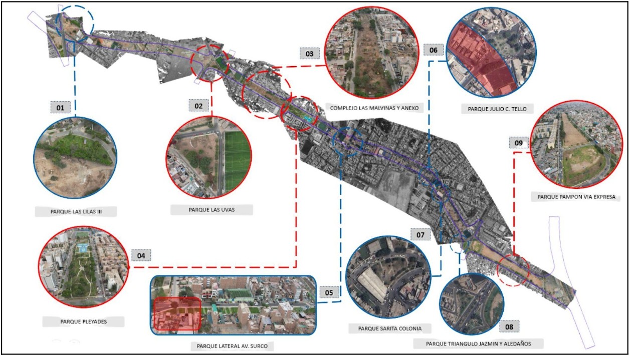 (9) Parque Las Lilas III, Parque Las Uvas, Parque Complejo las Malvinas y Anexo, Parque Pléyades, Parque Lateral Av. Surco, Parque Julio C. Tello y Parque Sarita Colonia, Parque Triángulo Jazmín y aledaños, y Parque Pampón Vía Expresa.