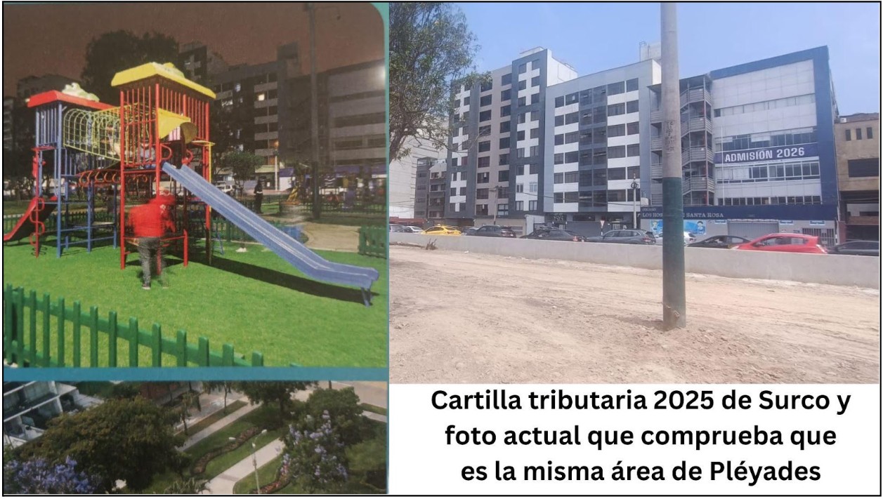Esto queda claro porque 1) la Municipalidad de Surco no tuvo una posición firme ni de defensa de los vecinos ante la proximidad y primeros días de pasar el bulldozer encima de parques como Precursores o Malvinas. Ningún vocero, ni el alcalde Bruce, dieron la cara hasta que los propios vecinos salieron a confrontar al personal y maquinarias de la MML que entraron a las 2 AM en Pléyades y le reclamaron su representación. 2) Dentro de los muchos ensayos de supuesta disputa, la Municipalidad de Surco y Bruce salieron a decir que aún estaba vigente el convenio sobre dicha área con la MML cuando sabían (12) de la caducidad de este acuerdo para generar espacios públicos y deportivos. 3) Carlos Bruce participó directamente y recorrió la "inauguración" de las auxiliares, lo que es no solo contradictorio en alguien que supuestamente criticaba la ausencia de un expediente técnico, sino que resulta imposible concebir una vía auxiliar sin la existencia de una vía principal pues por definición la auxiliar funciona como una amortiguación del flujo local con el de alto tránsito. Esta irresponsabilidad tuvo consecuencia no solo la generación de siniestros, sino que también aparecieron hundimientos antes de que cumpliera 3 meses de "inaugurada", lo que demostró el impacto de ejecutar la obra sin expediente técnico. 4) La Municipalidad de Surco ha tenido el desatino de promocionar como obra al Parque Pléyades en su cartilla tributaria 2025 a pesar que esto fue negado (13) por el alcalde. 5) Carlos Bruce ha salido en varias oportunidades y recientemente a declarar que la vía expresa sur y sus auxiliares no solo son una "gran obra" (14), sino que "dentro de las cosas buenas que ha tenido el alcalde López Aliaga ha concebido proyectos grandes que de ninguna manera deben ser paralizados, quizás puedan mejorar, pero su concepción de idea es buena o tratar de hacer un viaducto aéreo por la Javier prado para acelerar el tránsito es una obra bien concebida" (15).