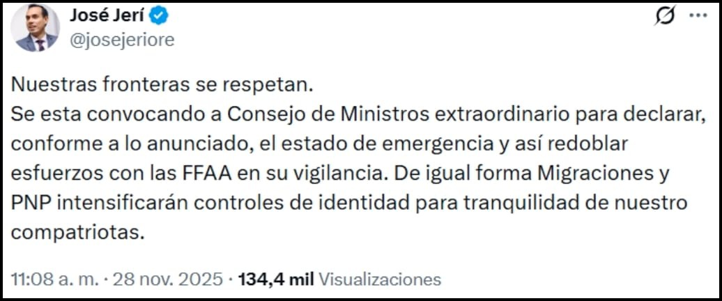 La frase "nuestras fronteras se respetan", escrita por el presidente peruano José Jerí en su cuenta de Twitter, tiene escaso sustento en la realidad y pocos ejemplos de que así ocurra.