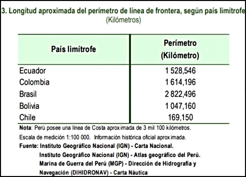 El mismo documento señala que nuestras fronteras tienen en total 7,180 kilómetros. La más extensa es la que compartimos con Brasil. Le siguen las fronteras con Colombia, Ecuador y Bolivia, en ese orden.
