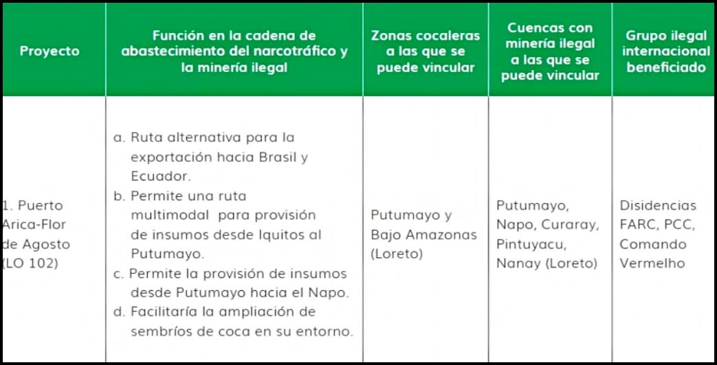 Uno de ellos es que el proyecto de la carretera "Puerto Arica - Flor de Agosto", en Loreto, se vincularía a zonas cocaleras y de minería ilegal, beneficiando a disidencias de las FARC y al Primero Comando Capital y Comando Vermelho, ambos de Brasil.