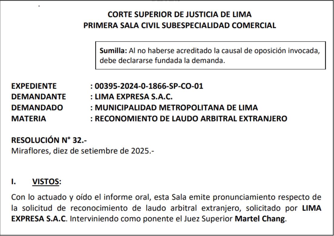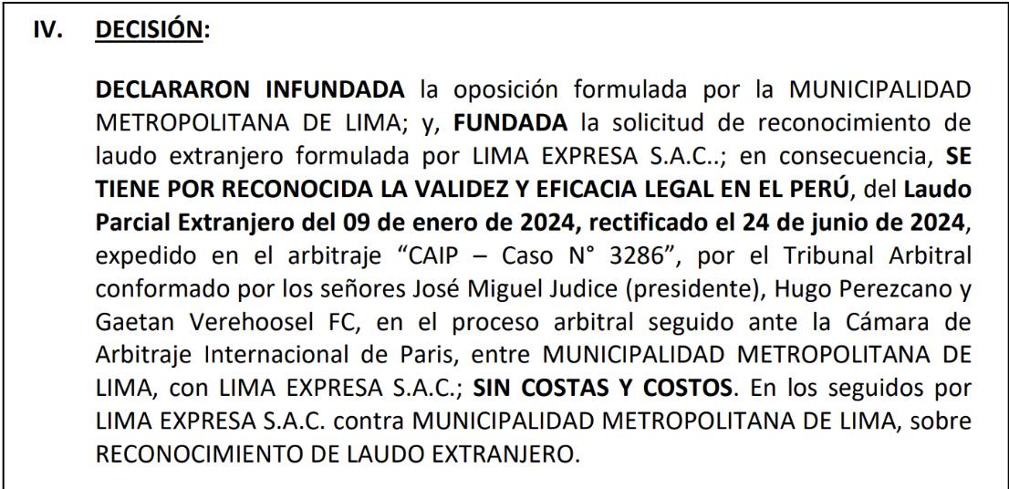 La Primera Sala Civil de Subespecialidad Comercial de la Corte Superior de Justicia de Lima resolvió por unanimidad reconocer el laudo arbitral parcial extranjero que en enero de 2024 resolvió no amparar la exigencia de la Municipalidad de anular el contrato de concesión de la vía Línea Amarilla por causal de corrupción, y con ello le dio "la validez y eficacia legal en el Perú".