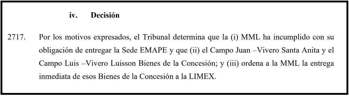 El tribunal arbitral también condenó a la Municipalidad de Lima por los daños causados como consecuencia de dicha negativa.