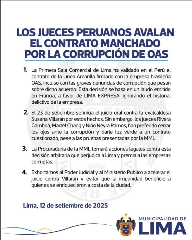 La gestión del alcalde López Aliaga respondió la tarde del viernes con un comunicado en sus redes sociales titulado "Los jueces peruanos avalan el contrato manchado por la corrupción de OAS", en referencia a la empresa constructora brasileña que en el 2009 firmó el contrato de concesión con el entonces alcalde Luis Castañeda Lossio por treinta años y posteriormente lo amplió a cuarenta con Susana Villarán.