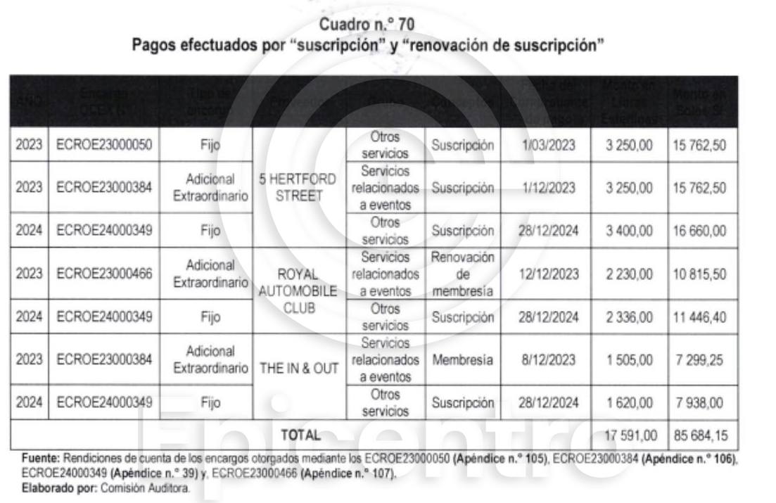 Romero Talledo destinó -según el informe- S/ 85.684,15 del erario nacional al pago de sus membresías y renovaciones en al menos tres exclusivos clubes privados de Londres, como 5 Hertford Street, Royal Automobile Club y The In&Out.