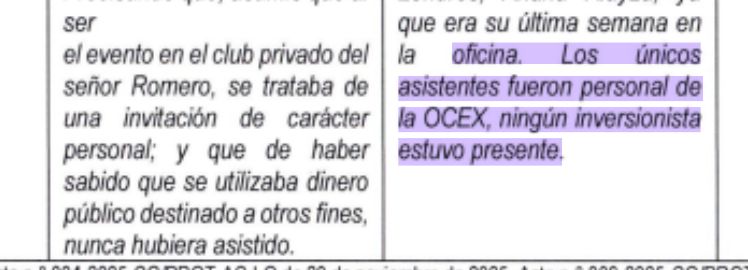 En sus informes iniciales, Romero declaró que se trató de una "atención a inversionistas británicos"; no obstante, uno de los trabajadores señaló a la Contraloría que "no hubo ningún potencial inversionista" en aquella fecha.