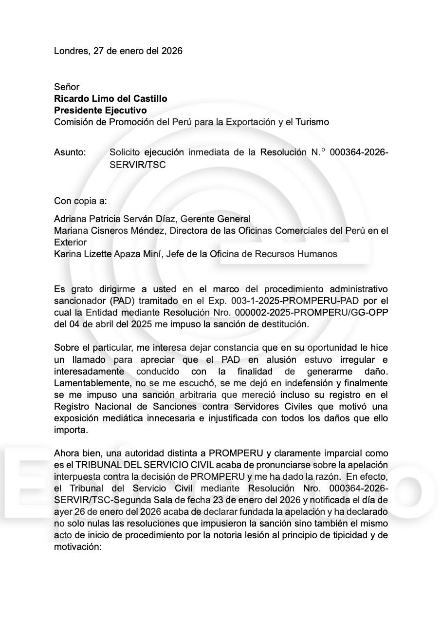 Pese a todo, el 27 de enero pasado Romero solicitó a PromPerú retornar a su cargo luego de que el Tribunal de Servir declarara fundada su apelación a la destitución.
