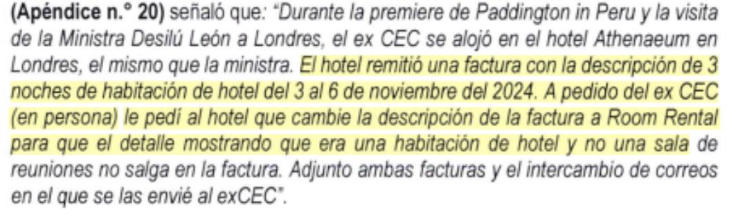 Durante el evento World Travel Market 2024, Romero presentó una rendición que consignaba el alquiler de una sala por 1 230 libras en dicho hotel, en el marco de la visita de la ministra de Comercio Exterior y Turismo, Desilú León. Pero una trabajadora de la OCEX Londres informó a la Contraloría que en realidad se trató del pago de una habitación y desayuno por tres noches para el propio Romero, quién, además, añadió consumos adicionales por 56 libras.