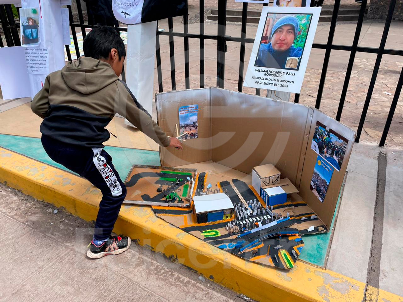 Ronald, un joven de 15 años y primo del herido William Nolberto Palli Rodríguez, recreó en una maqueta el brutal ataque policial a los manifestantes en el aeropuerto de Juliaca.