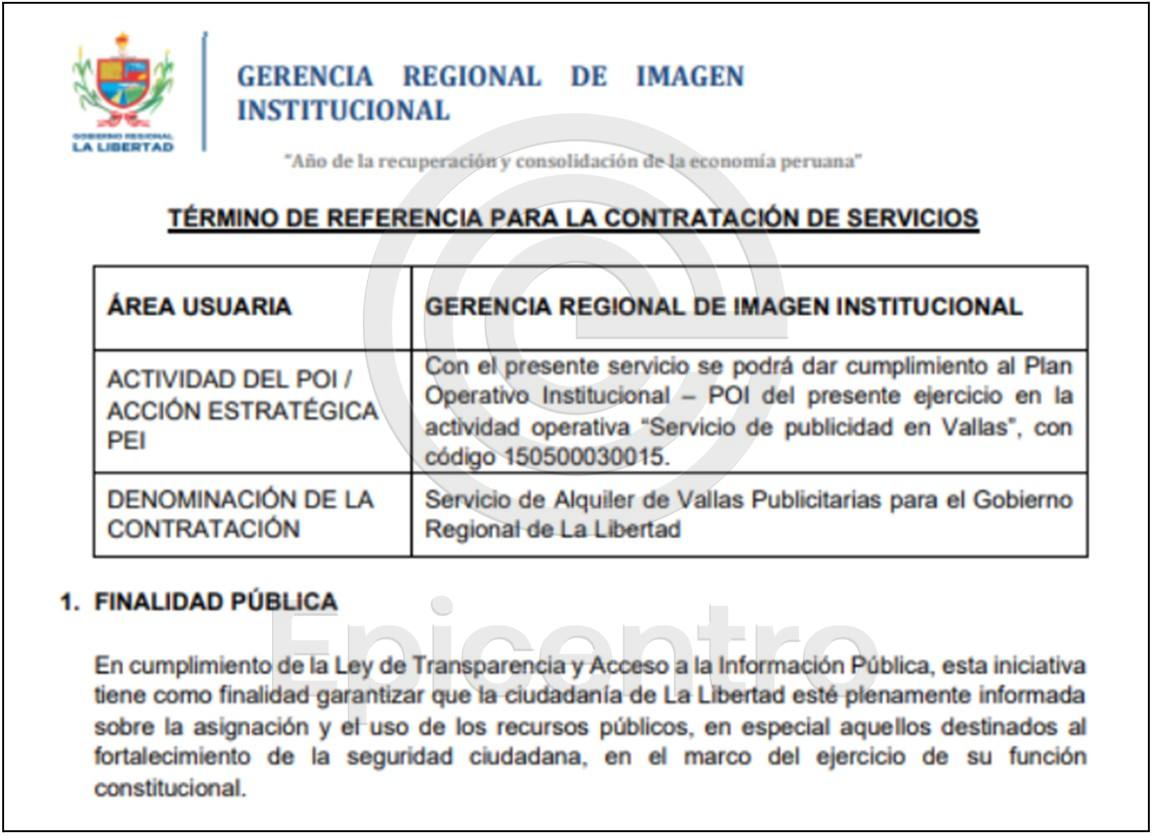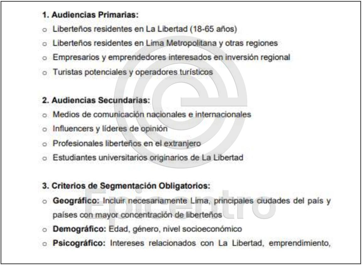 Según el expediente de contratación, la agencia deberá difundir información regional "tanto fuera como dentro del territorio regional" y dirigido a "liberteños residentes en Lima" y otras provincias. Será mediante Facebook, Instagram, Youtube y Google.