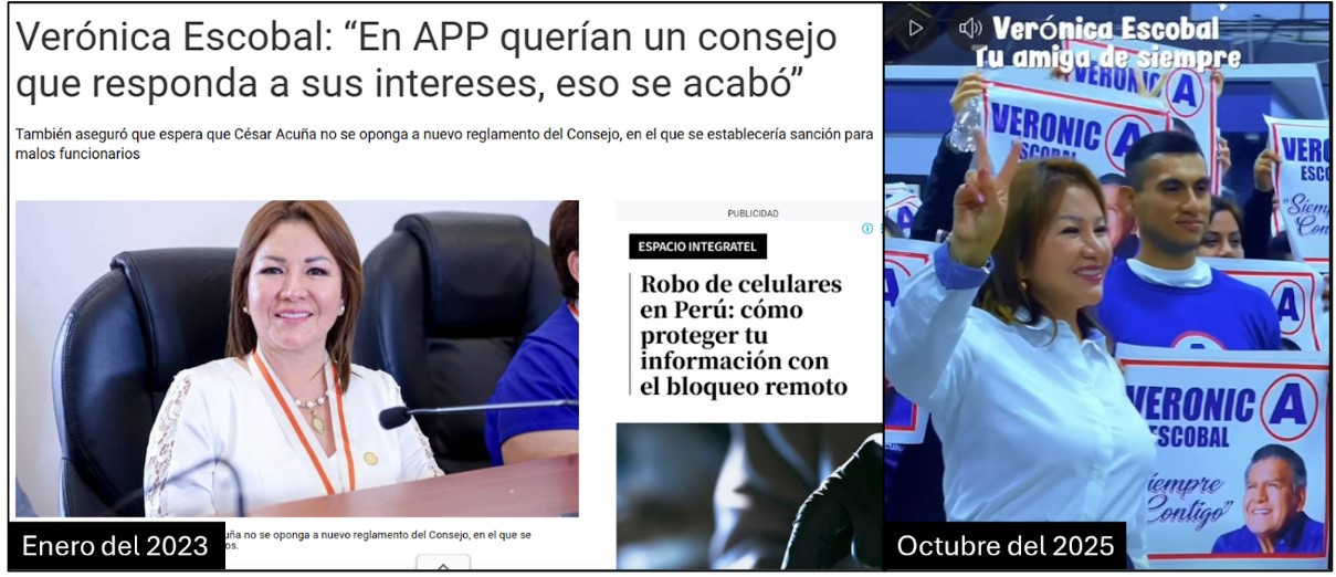 Además de Escobal, las consejeras Tania Carranza Blas, Gissela Crisólogo Polo y Leyla Espir Calderón pasaron de opositoras a coqueteos con Acuña, hasta ser sus seguidoras. Otro consejero opositor fue condenado por corrupción.