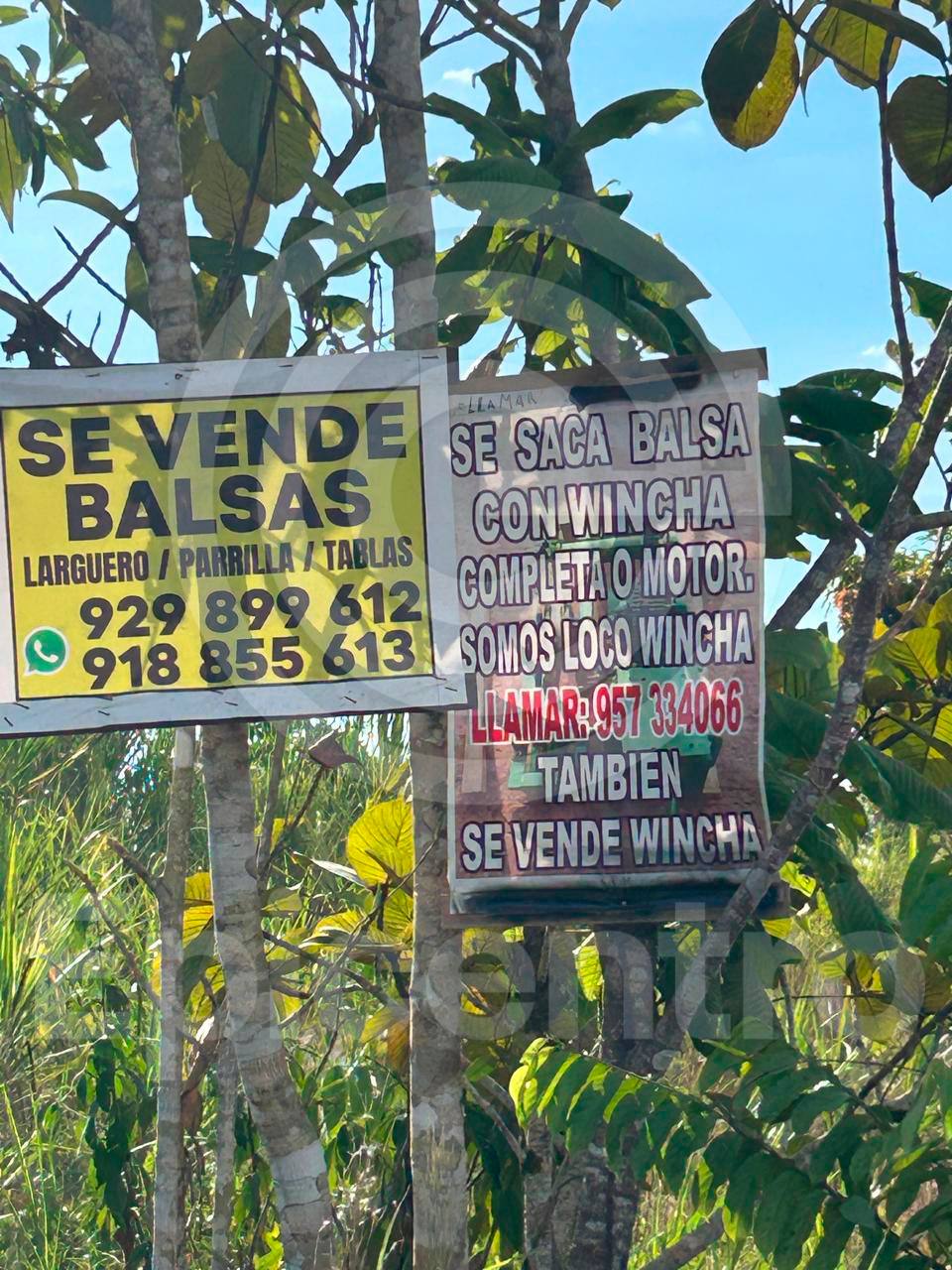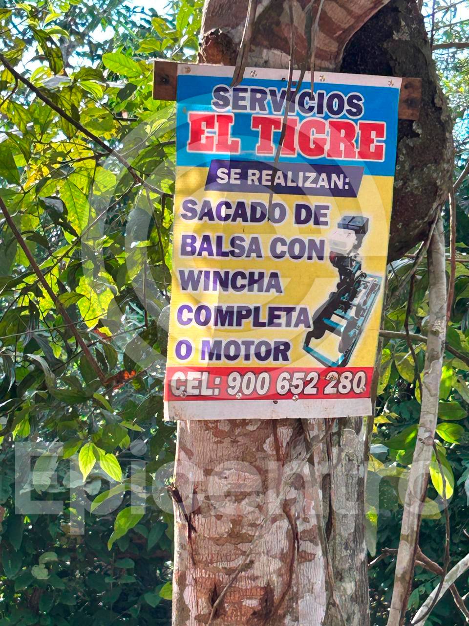 Seguimos ruta, y antes de llegar al segundo arenal, vimos unos letreros de colores clavados a los pocos árboles que deambulaban aterrorizados por ahí.  Uno decía: "Se saca balsa con wincha completa o motor. Llamar: 957334066. También se vende wincha."; otro más colorido y que con un sentido del marketing más desarrollado, decía: "Servicios El Tigre. Se realizan: sacado de balsa con wincha completa o motor. Cel: 900652280.", y junto a este mensaje la foto de una wincha. Como estos, logramos ver poco más de una decena, varios repetidos, pero podríamos decir que había 4 proveedores diferentes, al menos en la Ruta de los Tigres.