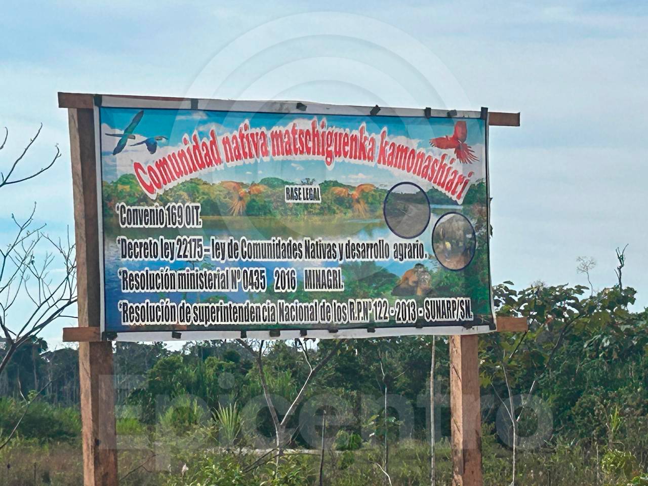 Cuando faltaban unos 200 metros para llegar a la siguiente zona de bosque, le pedí a Pedro que se detuviera. Me llamó la atención un letrero enorme a nuestra mano izquierda cerca de unos de los bordes del arenal. El letrero tenía de fondo una vista hermosa de una laguna rodeada de abundante vegetación, que me pareció podía ser una foto del Lago Sandoval que está dentro de la Reserva. En la parte superior se podía leer en letras de molde rojas: "Comunidad nativa matschiguenka kamonashiari".  Más abajo, en letras negras, decía: "Base Legal"; "Convenio 169 OIT"; "Decreto ley 22175-ley de Comunidades Nativas y desarrollo agrario"; "Resolución ministerial Nº 0435 2016 MINAGRI"; "Resolución de superintendencia Nacional de los R.P.Nº 122-2013- SUNARP/SN"
